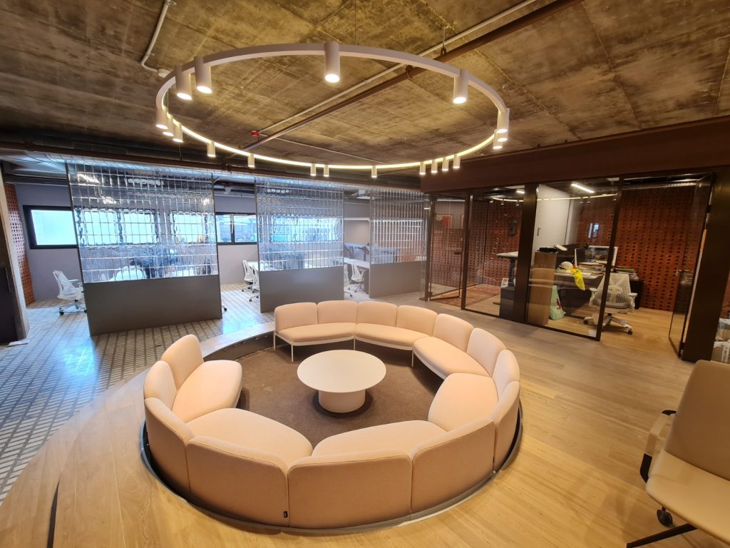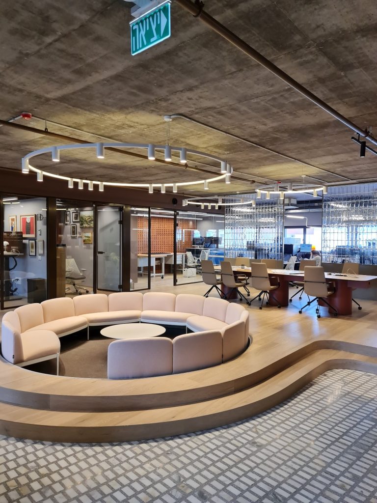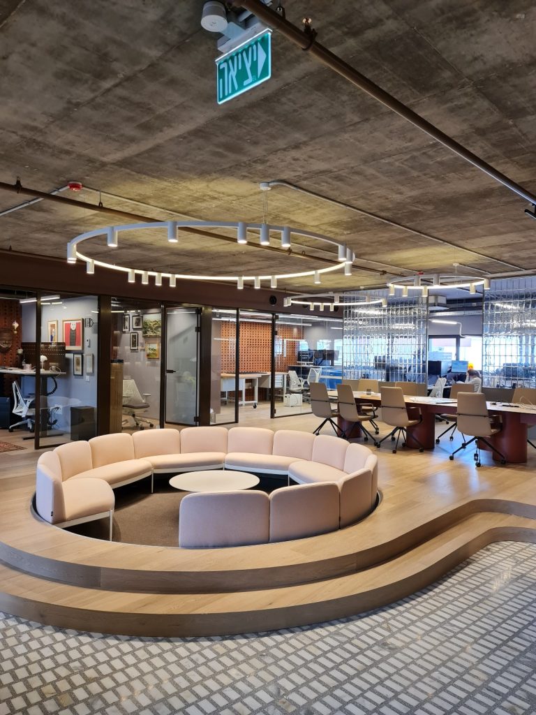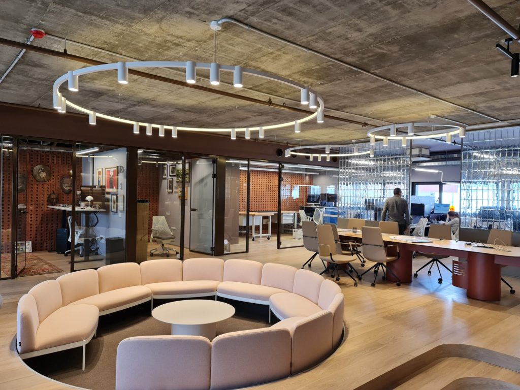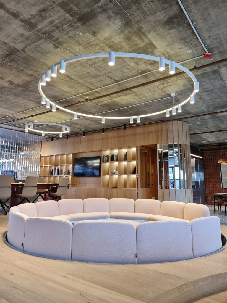 גופי התאורה העגולים התלויים מהווים את לב החלל. הם משלבים בין תאורת לד נסתרת להארה רכה ואחידה ובין ספוטים שקועים המכוונים מטה ומספקים פונקציונליות. הסידור העגול יוצר תנועה, הרמוניה וקשר ברור בין החללים במשרד.