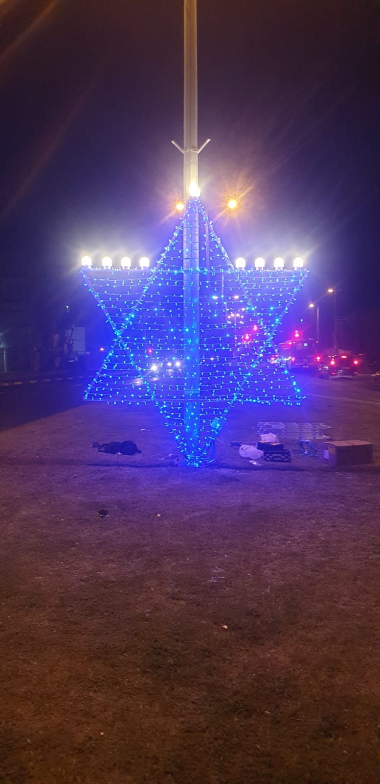 חנוכיית מגן דוד מוארת לעמוד תאורה