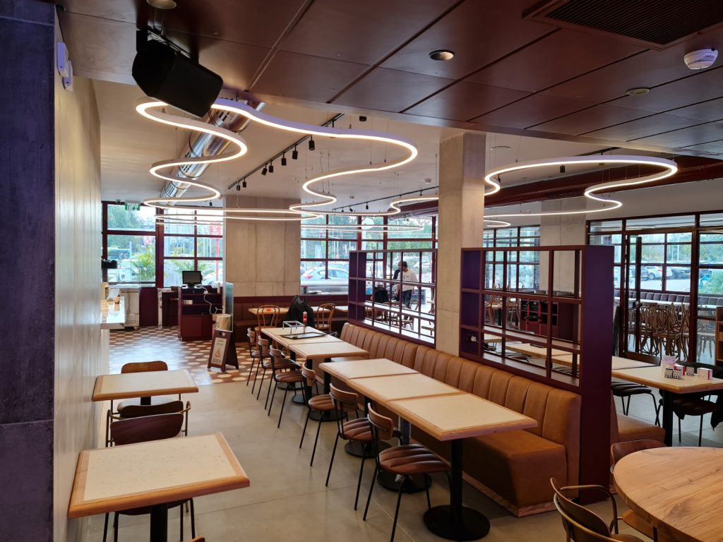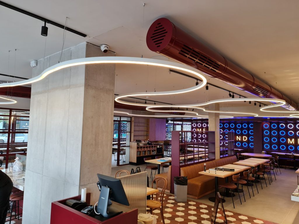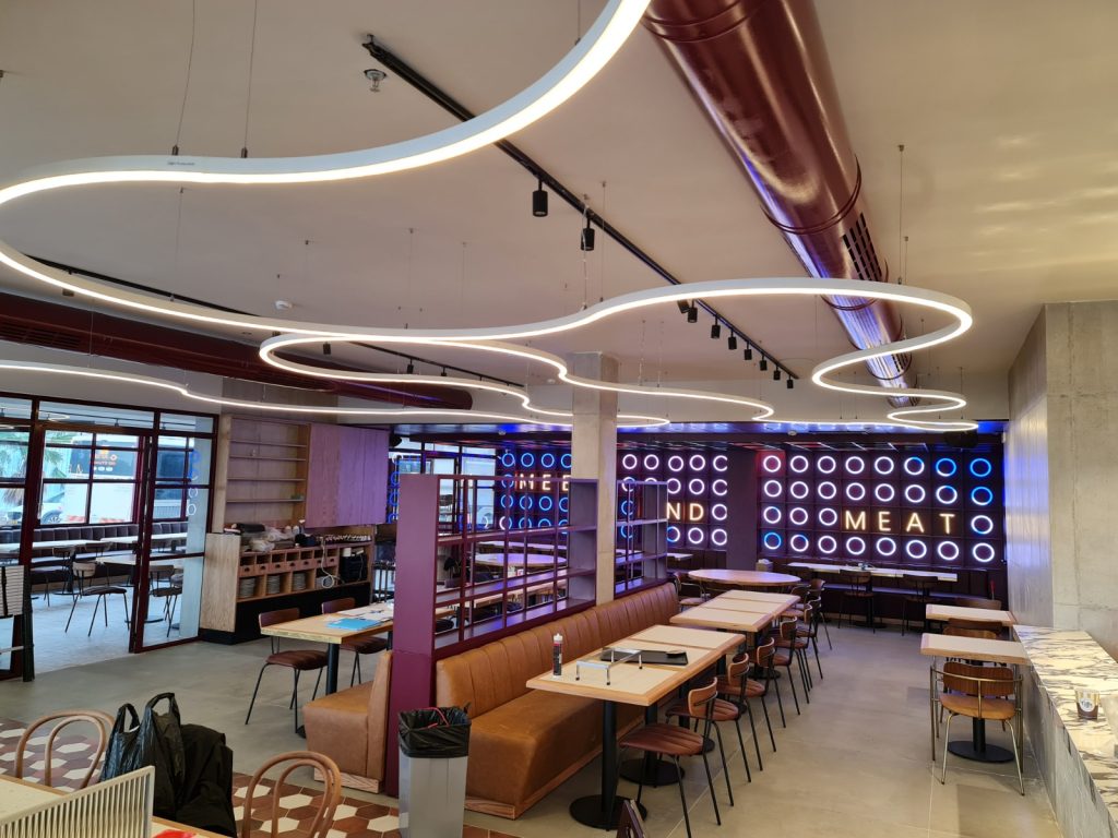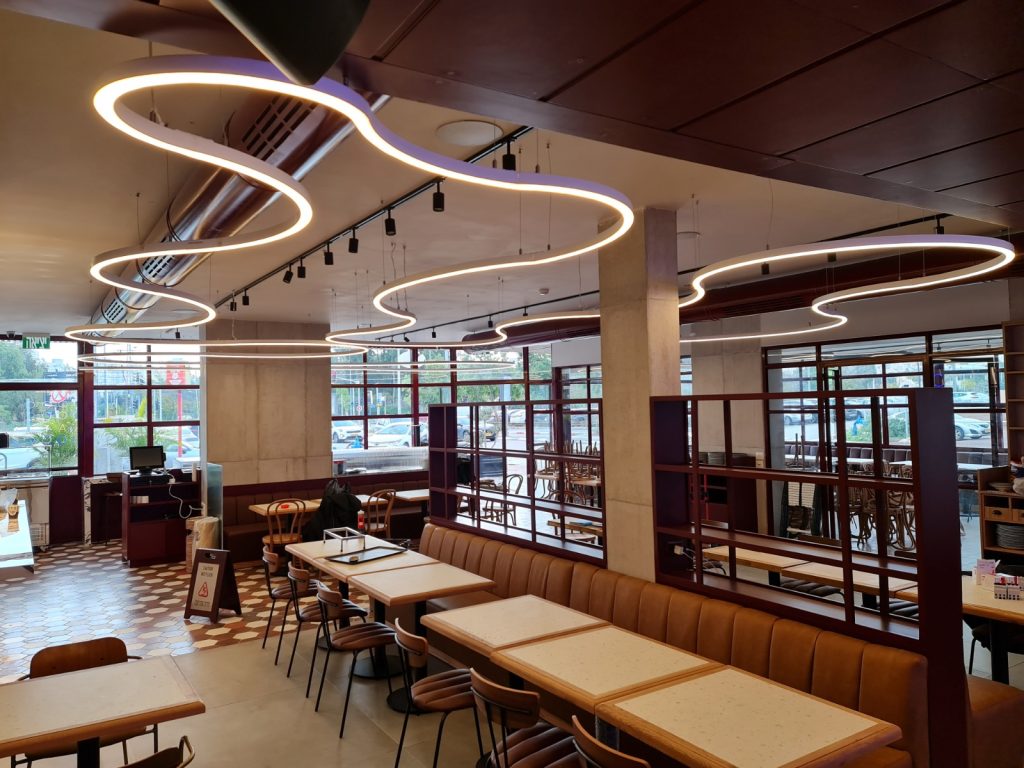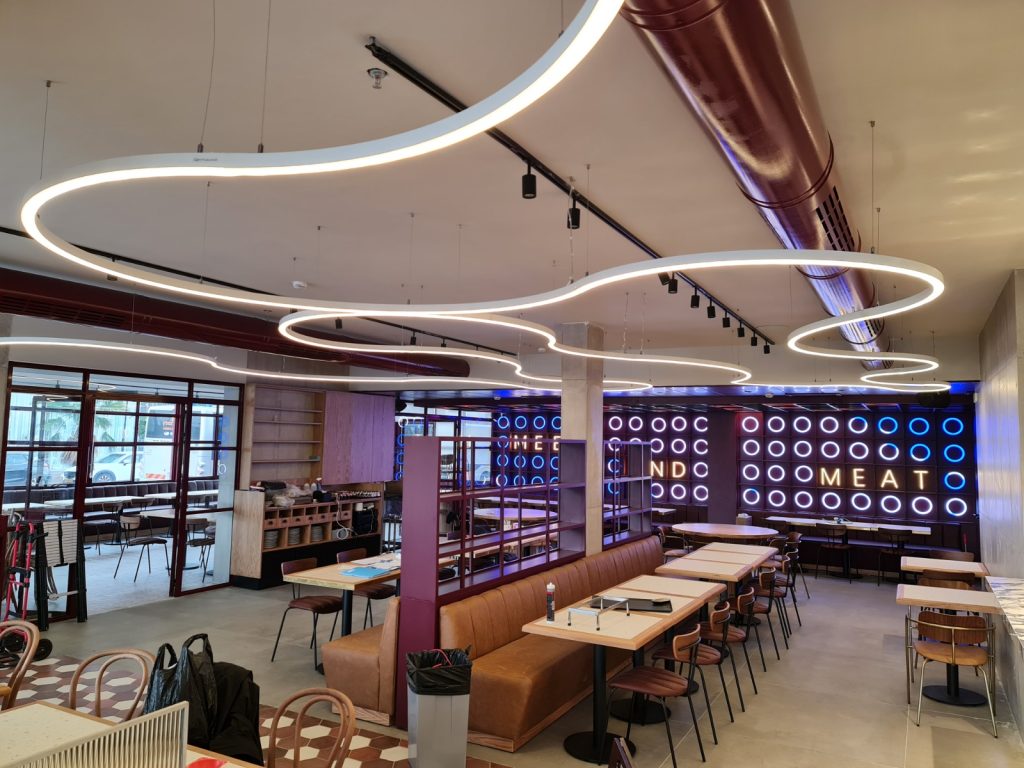 האלמנט הבולט ביותר בתקרה הוא מערכת של גופי תאורה תלויים בצורת פסים גמישים, המדמים קווים חופשיים מתפתלים. הפרופילים המעוגלים מוארים לאורכם בתאורת לד חמה, ומשרים תחושת תנועה זורמת ובלתי שגרתית לאורך החלל – כמו מסלול של אור שמלווה את הסועדים.