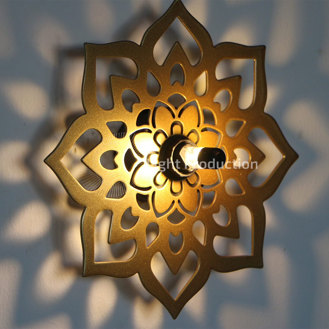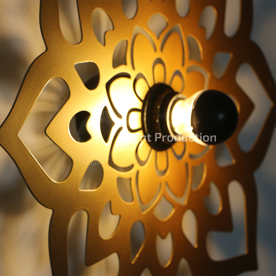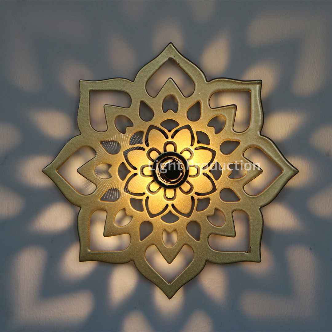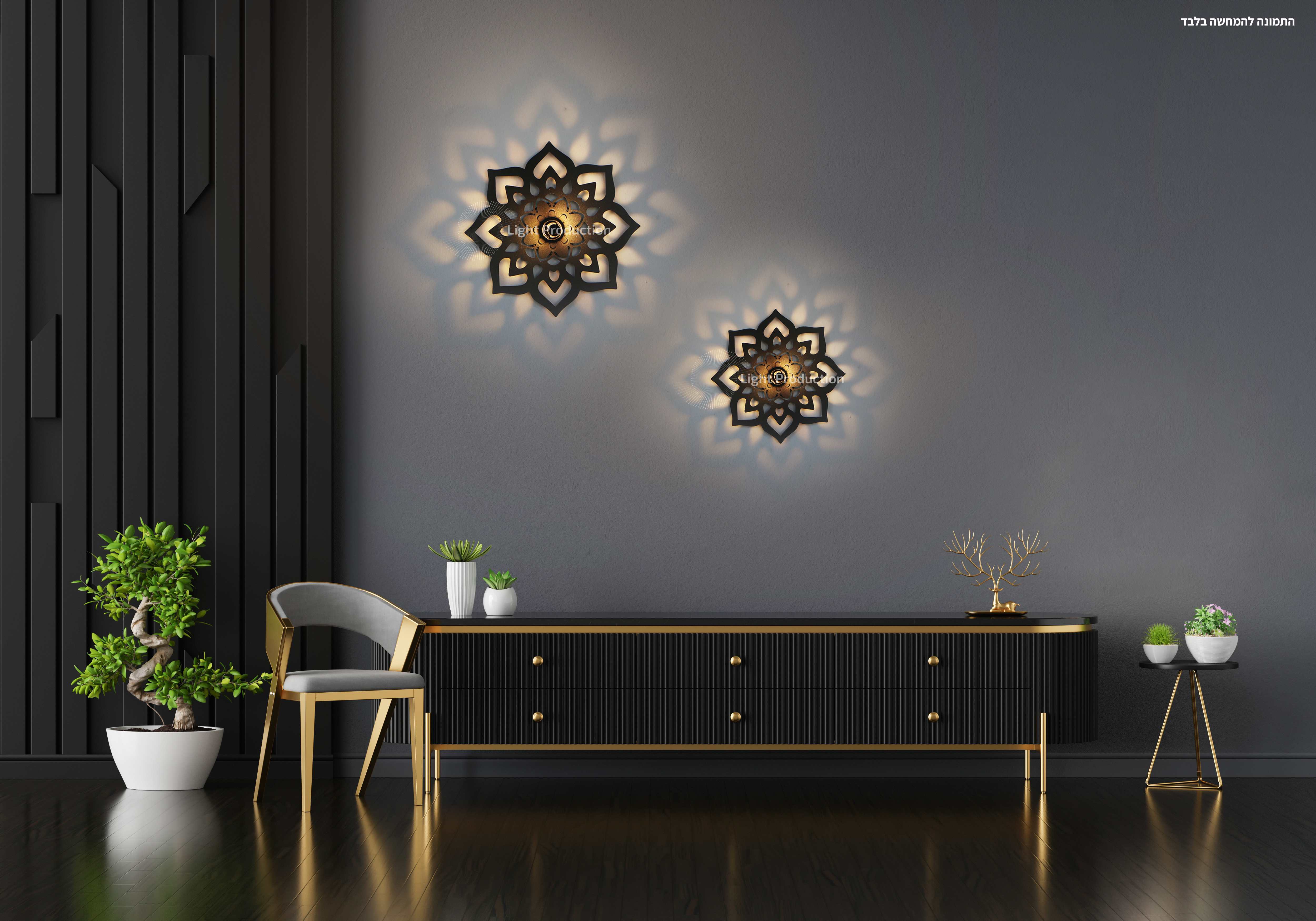 גוף תאורה מעוצב צמוד קיר בסלון כהה בגווני שחור וזהב